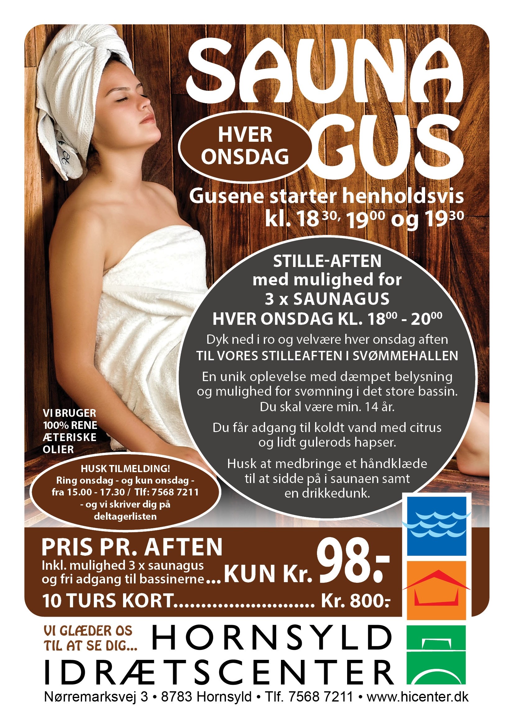 Find Saunagus-tiderne i svømmehallen, på hjemmesiden, på facebook eller spørg livredderne.